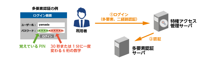 「PINコード+ワンタイムパスワード」といった多要素での認証、認証経路を二経路とするなど、認証強化を行うことで、特権アクセス管理サーバにログインするユーザーの厳格な本人確認を可能とし、なりすましを防止することができます。