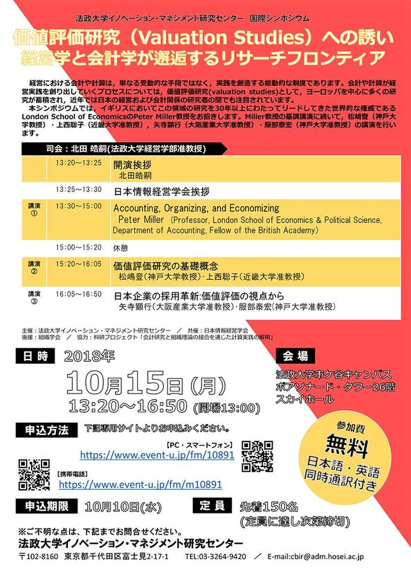 法政大学イノベーション・マネジメント研究センターでは、10月15日(月)に国際シンポジウム「価値評価研究(Valuation Studies)への誘い 経営学と会計学が邂逅するリサーチフロンティア」を開催します。