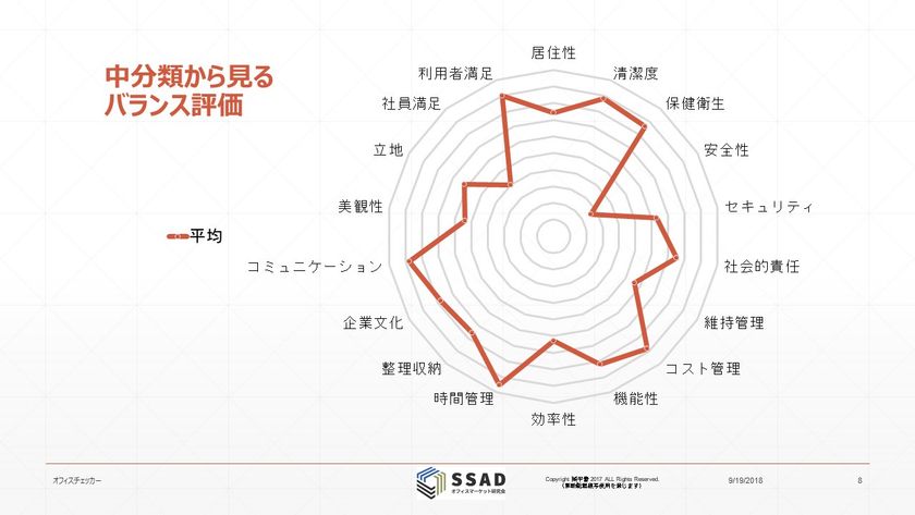 「オフィスチェッカー」はオフィス環境の整備面と運用面(5S)から5つの大分類、18の中分類、8つのタイプから生産性を分析するオフィス環境診断システムです。