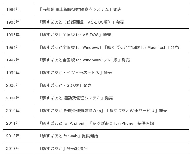 「駅すぱあと」は、まだ紙の時刻表や路線図、運賃表しかなかった1988年に、日本で最初に発売された経路検索システムです。当時は乗り継ぎ・運賃計算という専門分野に特化した人工知能・エキスパートシステムとして発売し、「駅すぱあと」の名前もこの“エキスパートシステム”に由来します。