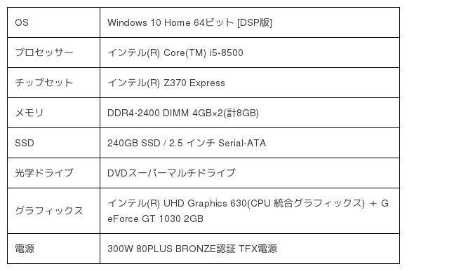 Core i5-8500 / 8GB RAM / インテル統合グラフィックス + GeForce GT 1030 / 240GB SSD / Windows 10 Home