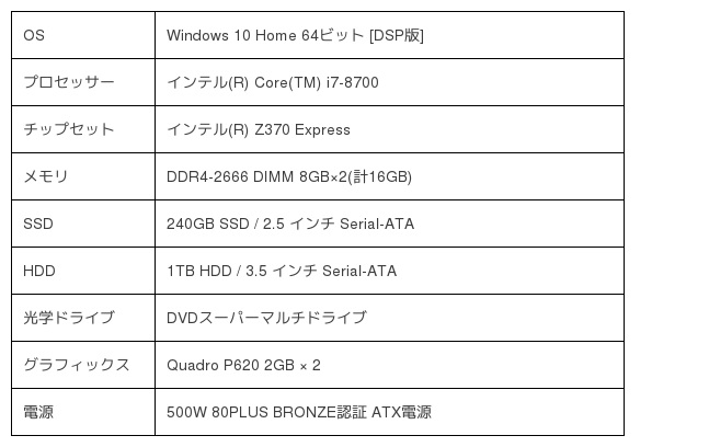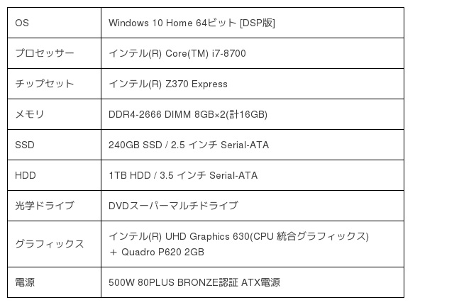 Core i7-8700 / 16GB RAM / インテル統合グラフィックス + Quadro P620 / 240GB SSD + 1TB HDD / Windows 10 Home