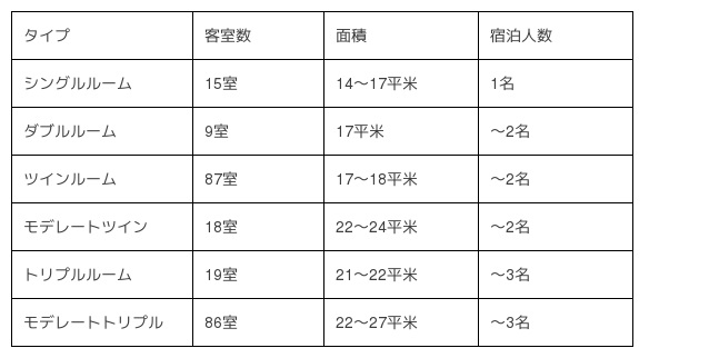 ■客室数:234室(シングル15室、ダブル9室、ツイン87室、モデレートツイン18室