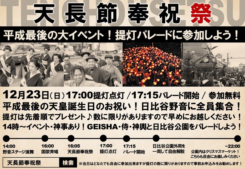 天長節奉祝祭実行委員会は、天皇陛下ご在位中の感謝の意を表するため、平成最後の天皇誕生日であります12月23日に、国民有志の参加者で「天長節奉祝祭」を執り行います。皇居を身近に感じられる日比谷公園外周において、提灯行列と神輿パレードをもって厳粛かつ盛大に奉祝をいたします。