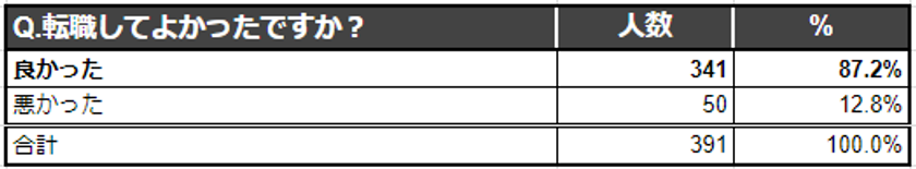 転職経験者に「転職してよかったですか?」とアンケートしたところ87.2%の方が転職してよかったと答えています。