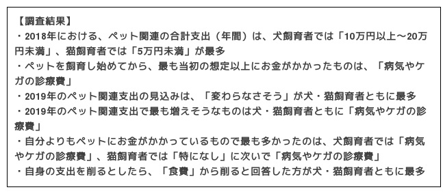 今回の調査では、「2019年のペット関連支出で最も増えそうなもの」および「ペットを飼育し始めてから、最も当初の想定以上にお金がかかったもの」について、「病気やケガの診療費」が最も多い結果となりました。