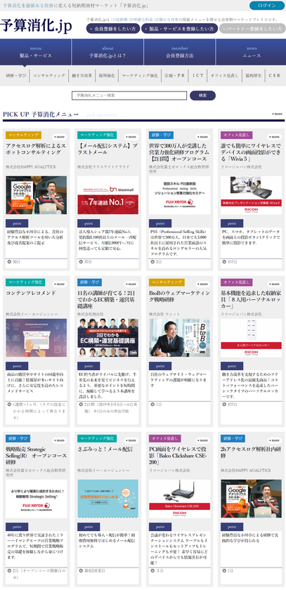 予算消化.jpは (1)短納期 (2)明確な料金 (3)確かな効果の投資メニューを探せる会員制マーケットプレイスです。予算消化.jpが登録された製品・サービスを審査することで、メニューの信頼性を担保します。また、料金については会員制内限定公開とすることで、マーケットプレイス上のユーザー同士がスムーズに商談できる環境を作ります。