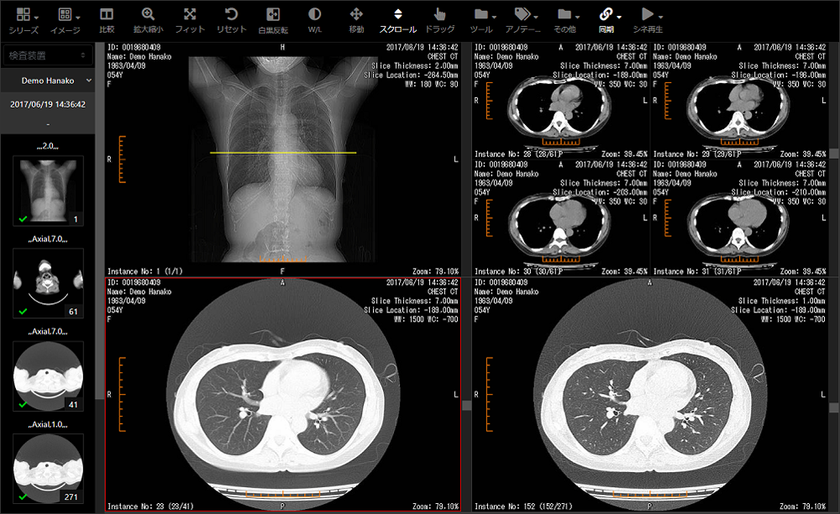 CTやMRIなどの検査装置で発生した画像を受信・管理する「DICOM(*1)サーバー」と、それらの画像を閲覧する「DICOMビューア」の2つの機能を合わせ持ったソフトウェア(PACS *2)です。