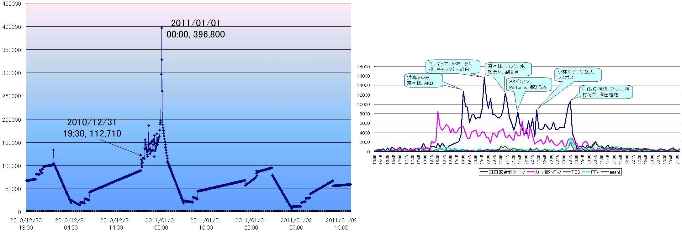図1.年末から年明けのツイート数推移/図2.大晦日の番組関連ツイート数推移