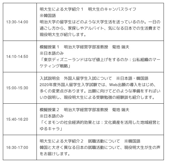 当日は教員による模擬授業や職員、韓国人現役学生、卒業生及び交換留学経験者による大学説明、個別相談等を行います。