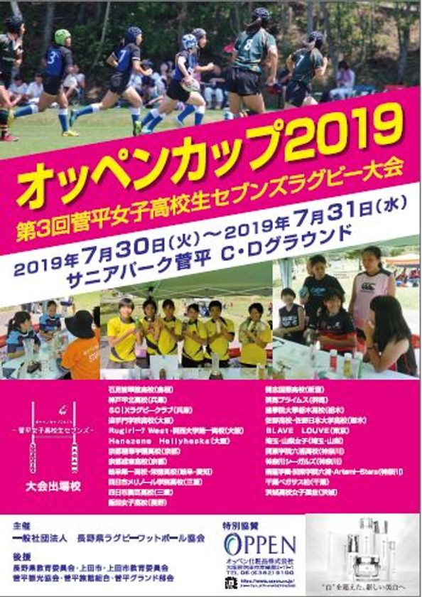 化粧品・医薬部外品および健康食品の製造販売からエステティックアカデミー運営などを行うオッペン化粧品株式会社(本社:大阪府吹田市、代表取締役社長:瀧川 照章)は、サニアパーク菅平にて2019年7月30日(火)・31日(水)に開催する女子高校生のセブンズラグビー全国大会『第3回 菅平女子高校生セブンズラグビー大会(主催:一般社団法人長野県ラグビーフットボール協会)』へ特別協賛いたします。