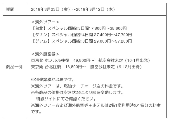 また、海外航空券では「ホノルル往復(東京発)」49,800円〜、「台北往復(東京発)」16,800円〜などお得な価格で販売します。先日リリースした、航空券とホテルを自由に組み合わせることが出来る「エアトリプラス」でもお得な商品を数多く取り揃えています。