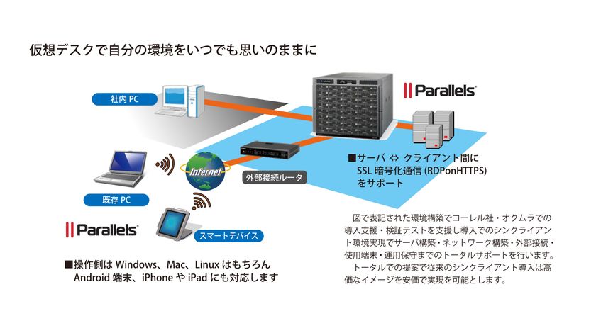 また、オクムラでは、Parallels RASをシンクライアントシステムと組み合わせて、中規模ビジネス向けソリューションシステムの運用とローコスト端末(リユースPC&レンタル)の提供により、IT投資の削減化による「ローコスト経営」の実現にも寄与して参ります。