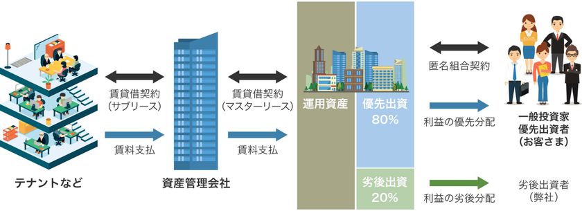 投資家の皆さまにご安心いただけるよう、リスク対策としてテナント賃料の下落が20%までは事業者が負担する優先劣後システムを採用。しかも、資産管理会社と契約賃料が確定したマスターリース契約を締結するなど、投資家保護を徹底しています。また、分配後の残余利益の半分以上を社会貢献活動の一環として、あしなが育英会に寄付いたします。