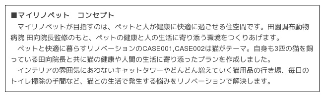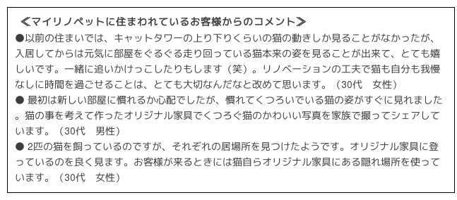 マイリノペットforねこは獣医師と共に、猫と人が一緒に暮らすことにより生じる負担を減らし、猫も人も楽しく健康的に長生きできる住まいづくりを行います。