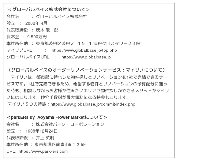 グローバルベイス株式会社(代表取締役:茂木敬一郎、以下、「グローバルベイス」)と青山フラワーマーケットを運営する株式会社パーク・コーポレーションのグリーン空間事業「parkERs by Aoyama Flower Market」(代表取締役社長:井上英明、以下、「パーカーズ」)は、マンション・リノベーション業界初の植物との暮らしに特化したリノベーションプランの第2弾「GREEN DAYS(グリーンデイズ)CASE002(以下、CASE002)」を2019年10月30日より提供開始いたします。