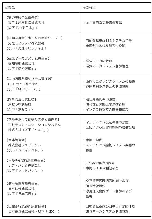 JR東日本、先進モビリティ株式会社(代表取締役社長:青木 啓二)、愛知製鋼株式会社(代表取締役社長:藤岡 高広)、SBドライブ株式会社(代表取締役社長 兼 CEO:佐治 友基)、京セラ株式会社(代表取締役社長:谷本 秀夫)、京セラコミュニケーションシステム株式会社(代表取締役社長:黒瀬 善仁)、株式会社ジェイテクト(取締役社長:安形 哲夫)、ソフトバンク株式会社(代表取締役 社長執行役員 兼 CEO:宮内 謙)、日本信号株式会社(代表取締役社長:塚本 英彦)および日本電気株式会社(代表取締役 執行役員社長 兼 CEO:新野 隆)はJR東日本が主催するモビリティ変革コンソーシアムにおいて、「JR東日本管内のBRTにおけるバス自動運転の技術実証」を実施します。