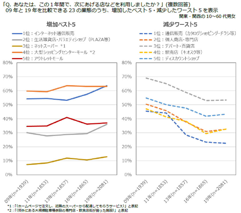 09年→19年で「インターネット通信販売」は利用率が10ポイント弱増加、次いで「生活雑貨店・バラエティショップ」「ネットスーパー」が5ポイント増。「大型SC」は13年以降横ばい。