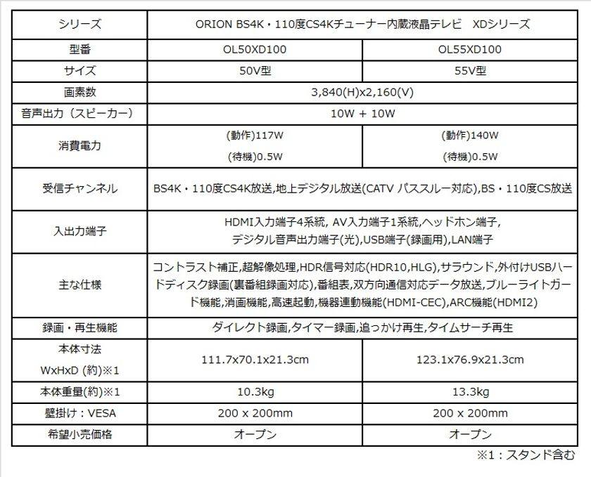 ORION 50型/55型 BS4K・110度CS4Kチューナー内蔵液晶テレビ