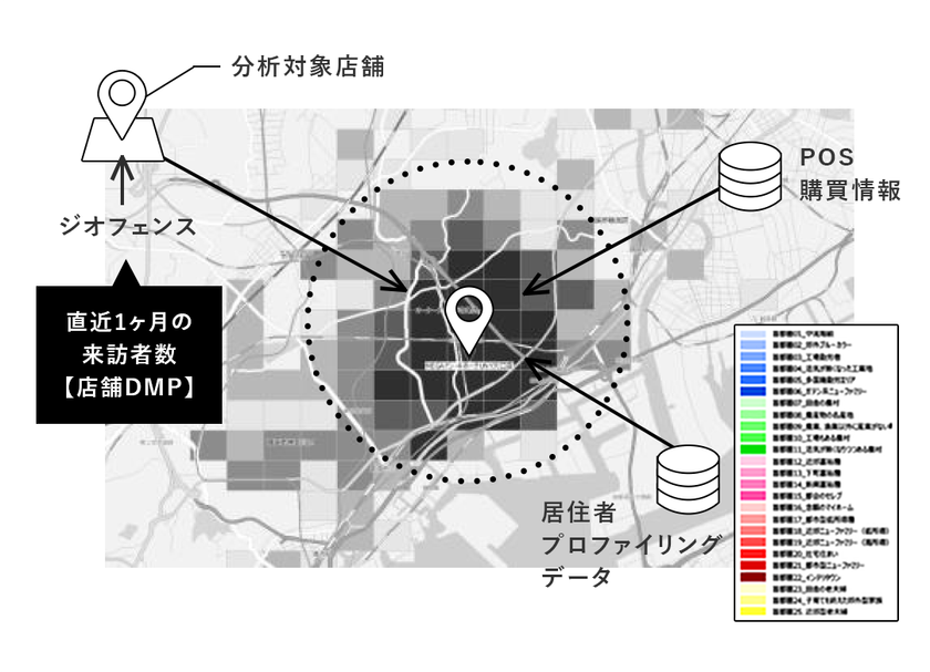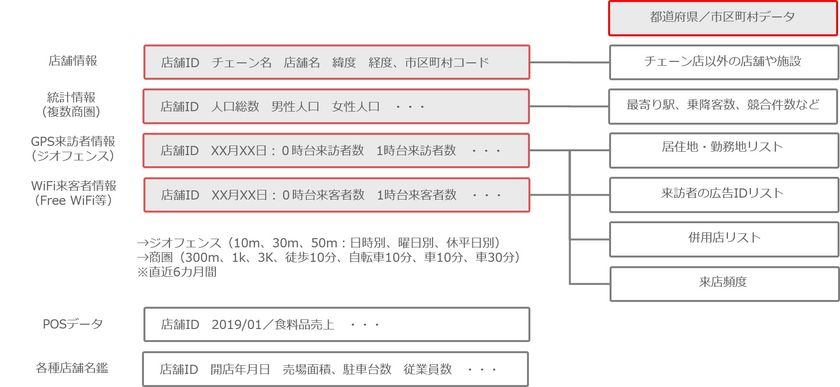 店舗DMPは、正式リリース第一弾として、独自のコード体系で整備された更新頻度の高いチェーン企業の全国約70万店舗が対象です。各店舗を中心に、複数の円形商圏や自動車到達圏を設定し、 昼間夜間特性、富裕度、商業力、消費購買力、将来人口といった商圏データを各種統計データから集計、属性として付与しています。また、GPSデータやWi-Fiデータを用いて、店舗への来訪者数、曜日別・時間帯別傾向、来訪者の居住地/勤務地、来訪者の広告IDを紐付けています(※)。提供方法は、データベース、クラウドストレージ、APIとなります。