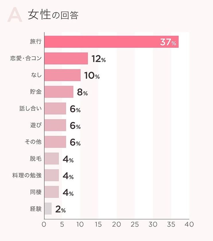 男女ともに割合が多かった回答は「旅行」で、男性の17%、女性の37%が挙げています。結婚すると相手との時間を大切にする手前、一人旅や友人と旅行をするタイミングを作るのが難しくなってしまうことも背景にあるようです。もしも行きたい場所があるなら、自分の時間がしっかり持てる結婚前に気兼ねなく旅行を楽しんでおくと良いかもしれません。(参考サイト: https://www.jalan.net/news/article/314608/ )