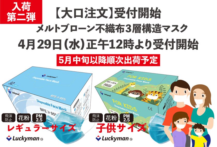 【マスク予約販売開始】4月29日(水)正午12時より自社ECサイトで受付開始5月13日(水)より順次出荷予定 メルトブローン不織布3層構造マスク