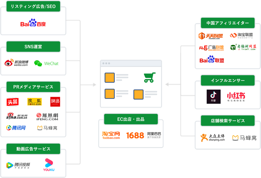 リスティング、SNS代行、アフィリエイト、SEO、動画広告など中国のWebマーケティングソリューションの分野では7、8割カバーできます。