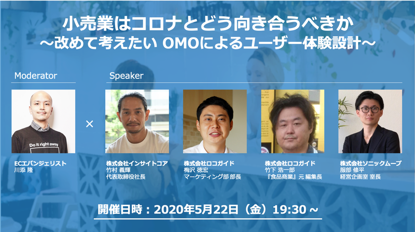 株式会社ソニックムーブ(本社:東京都新宿区、代表取締役:大塚 祐己)は、ECエバンジェリスト 川添 隆氏、株式会社インサイトコア(本社:東京都港区、代表取締役:島田 大介、竹村 義輝)、株式会社ロコガイド(本社:東京都港区、代表取締役:穐田 誉輝)と共同し、2020年5月22日(金)にオンラインにて、小売業の方向けにオンラインセミナー『小売業はコロナとどう向き合うべきか 〜改めて考えたい OMOによるユーザー体験設計〜』を開催いたします。