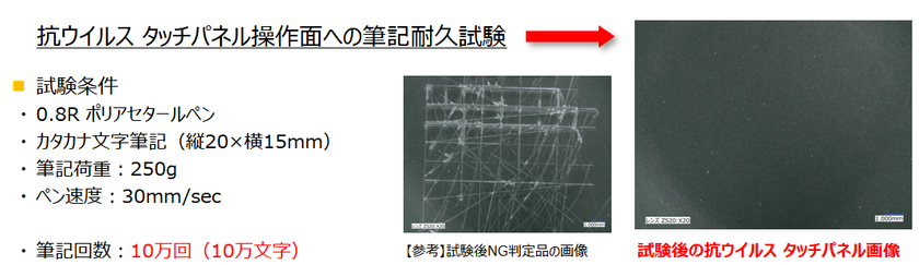 当社の抗ウイルス・タッチパネル製品は、抗ウイルス加工後においても通常動作に影響がないことを確認済。また、その操作面に対して10万回(10万文字)の筆記を行ってもキズが入らないことを社内試験で確認しています。