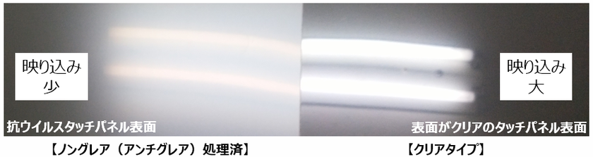 タッチパネルの操作面上に貼られる抗ウイルスフィルムは貼り換えが可能ですので、タッチパネル本体の保護フィルムとしても機能します。特に公共のタッチパネルは使用期間が長く、不特定多数の人々が利用することから、傷などの外的損傷が生じやすいですが、そのリスクも減らすことができます。また製品表面はノングレア(防眩)処理がされています※ので、画面への映り込みを抑え視認性を向上させると共に、付着した指紋を目立たなくさせる効果もあります。