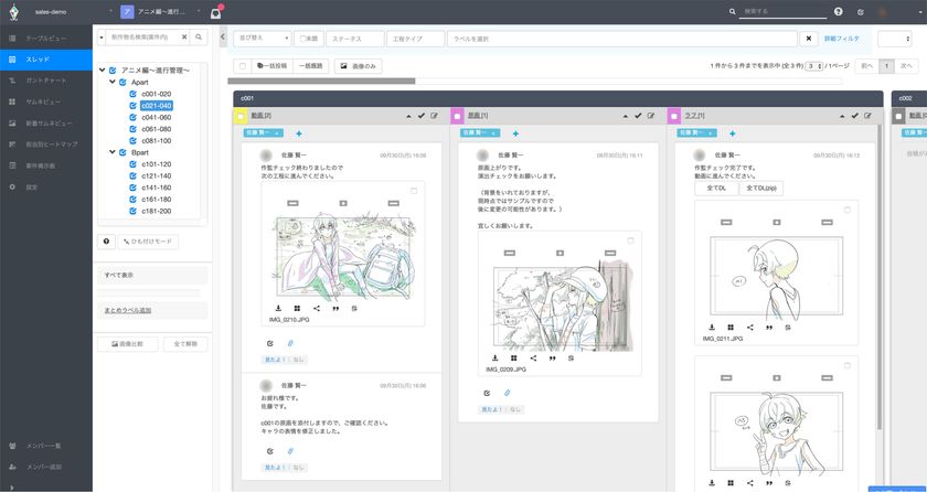 絵コンテや原画や動画など素材の納品から、監修や修正指示といったコミュニケーションまで、アニメ制作のやり取りをブラウザ上で一元化。