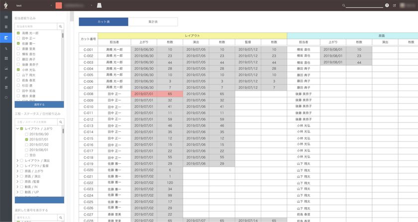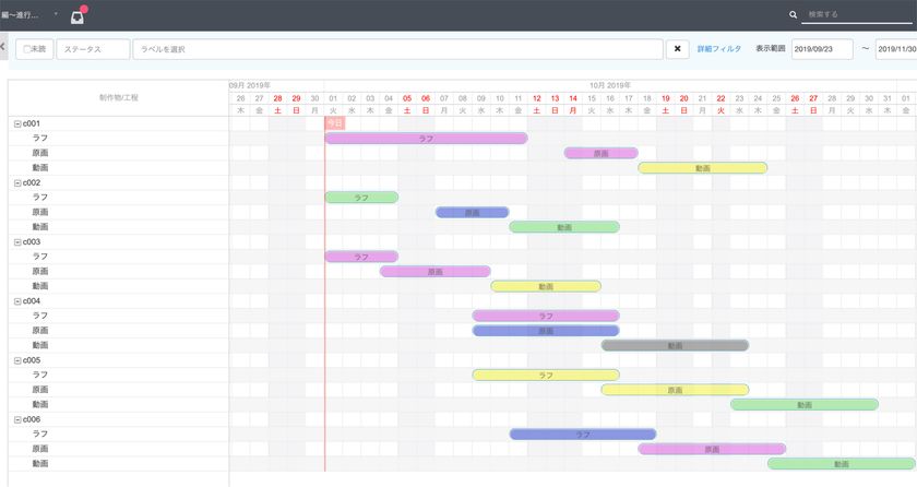 工程スケジュールがひと目でわかるガントチャートも実装。大人数が多数の工程にわかれて分業するアニメの制作管理を効率化します。