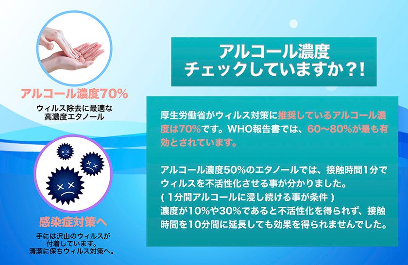 ウイルス対策に最適なALC75%配合。夏場にも様々なウイルス、感染症が流行するため、持ち運びに最適なサイズにしました。