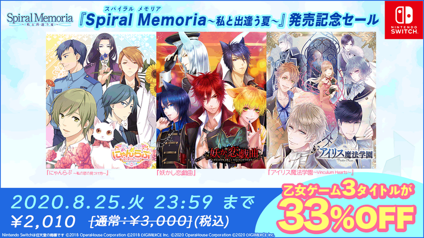 株式会社デジマース(本社:東京都品川区、代表取締役社長:石川 達絵)は、株式会社オペラハウス(本社:東京都千代田、代表取締役:金子 隆二)原作の乙女ゲーム『Spiral Memoria〜私と出逢う夏〜』(スパイラルメモリア)をNintendo Switch(TM)向けに移植し、2020年7月30日(木)よりニンテンドーeショップにて配信いたします。