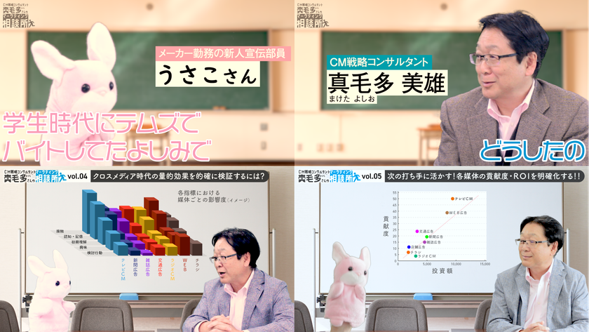 各動画の冒頭では、テレビCM展開において実際に企業が抱えるような課題や問題点を提示。それらをテーマとして、「うさこ」から投げかけられる疑問・質問を、「CM戦略コンサルタント 真毛多(まけた)さん」がクリアにしていきます。