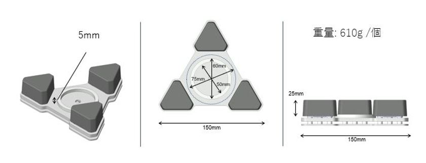 ●インシュレータ一個あたり、ウェルフロートメカを3つ内蔵することで、1個250kgの耐荷重を実現(ハイエンドラックとも共通の機構)