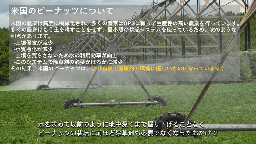 今回のセミナーの第1部では、環境に配慮した栽培の工夫や少ない水資源で育つピーナッツの特長などについて、米国落花生組合のシニア・バイスプレジデント/CMO ライアン・ルピシエ氏よりビデオレターにて解説いただきました。