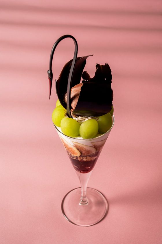 プリマドンナのように凛とした黒鳥が降りたったグラスには甘く魅惑的な秋のスイーツがいっぱい。