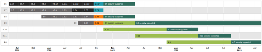 2020年9月の時点でサポートがされているのは、最新バージョンである3.9および3.5, 3.7, 3.8のみです。