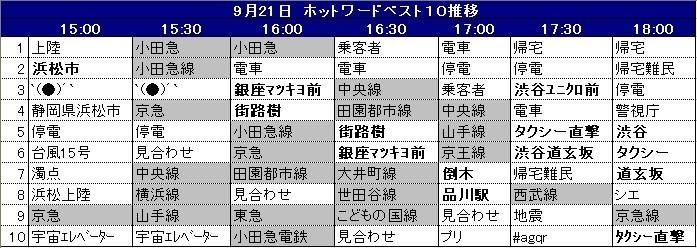 9月21日夕方の30分おきのホットワードベスト10の推移を見ると、「浜松市」に上陸してから首都圏で、次々と電車が運転見合わせになっていき、銀座や渋谷での倒木(「銀座マツキヨ前」「渋谷道玄坂」「タクシー直撃」など)や「品川駅」での混乱がツイートされるなど、映像で台風の威力が伝えられ伝播している様子が覗えます。