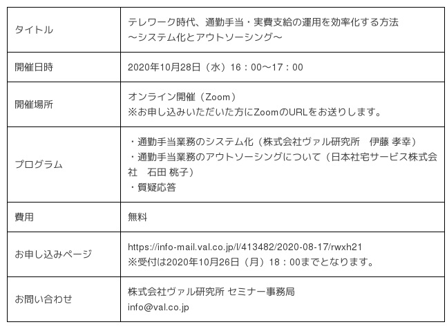 【開催直前・人事向け】通勤手当の管理業務を95%削減!システム化とアウトソーシングで効率化する方法10/28 無料ウェブセミナー開催