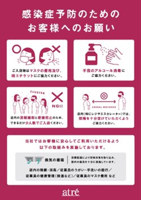 アトレでは、お客様、従業員及び関係者の皆様の安全性を考慮し、新型コロナウイルス感染拡大防止の為の対策を講じます。また、来店されるお客様へのご協力のお願いがございます。