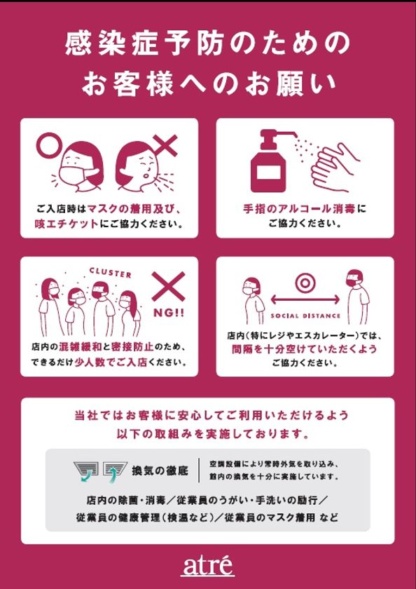 アトレでは、お客さま、従業員及び関係者の皆様の安全性を考慮し、新型コロナウイルス感染拡大防止の為の対策を講じます。また、来店されるお客さまへのご協力のお願いがございます。