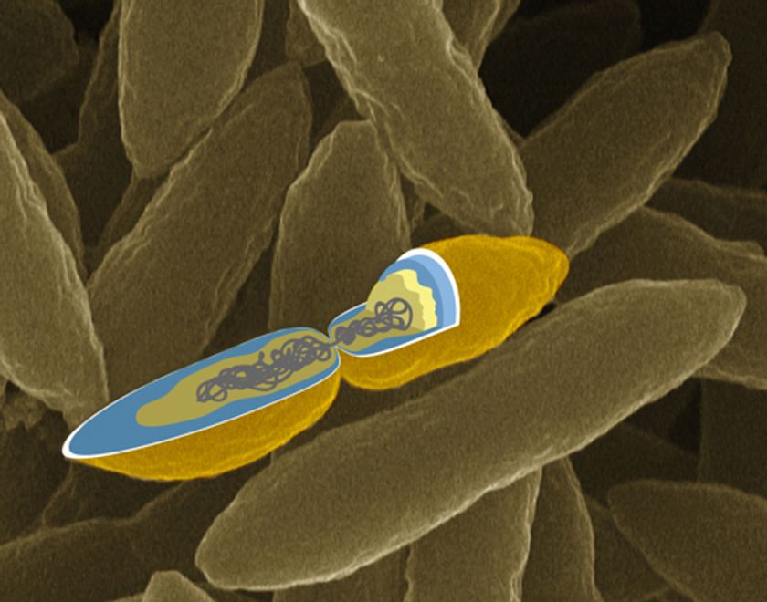 顕微鏡観察に基づいてイラスト化した分裂中のRT761株の細胞内構造。ゲノムDNA(灰色線)が細胞内膜(クリーム色)に包まれている。