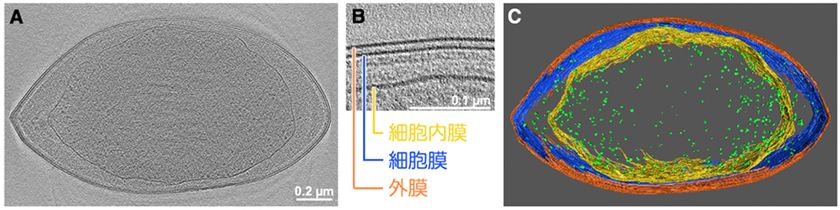 (A) RT761株の細胞内構造。(B) 膜構造の拡大写真。(C) (A)の細胞をさまざまな角度から撮影し復元した立体構造。細胞内膜(黄)、細胞膜(青)、外膜(橙)、リボソーム様粒子(緑)。リボソーム様粒子は細胞内膜の内側と外側の両方に観察された。