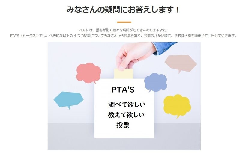 例えば、「調べて欲しい教えて欲しい」というコンテンツでは、誰もが抱くPTAに関する疑問(「PTAが任意加入ってホント?!」「PTAで“個人情報”ってどこまで守ればいいの?」等)に投票を募り、投票数が多い疑問から法的な根拠も踏まえた解答を発信していきます。