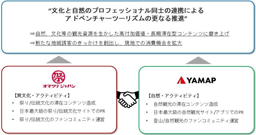 祭り・伝統文化に強みをもつオマツリジャパンと、自然・アウトドア分野に強みをもつヤマップとが連携をすることで、観光庁がポストコロナ観光政策の注力分野に位置づけている「アドベンチャーツーリズム」を推進し、来たるインバウンド需要回復期に向けて、国内のみならず海外の観光客を惹きつける高付加価値かつ長期滞在型の観光コンテンツを提供いたします。