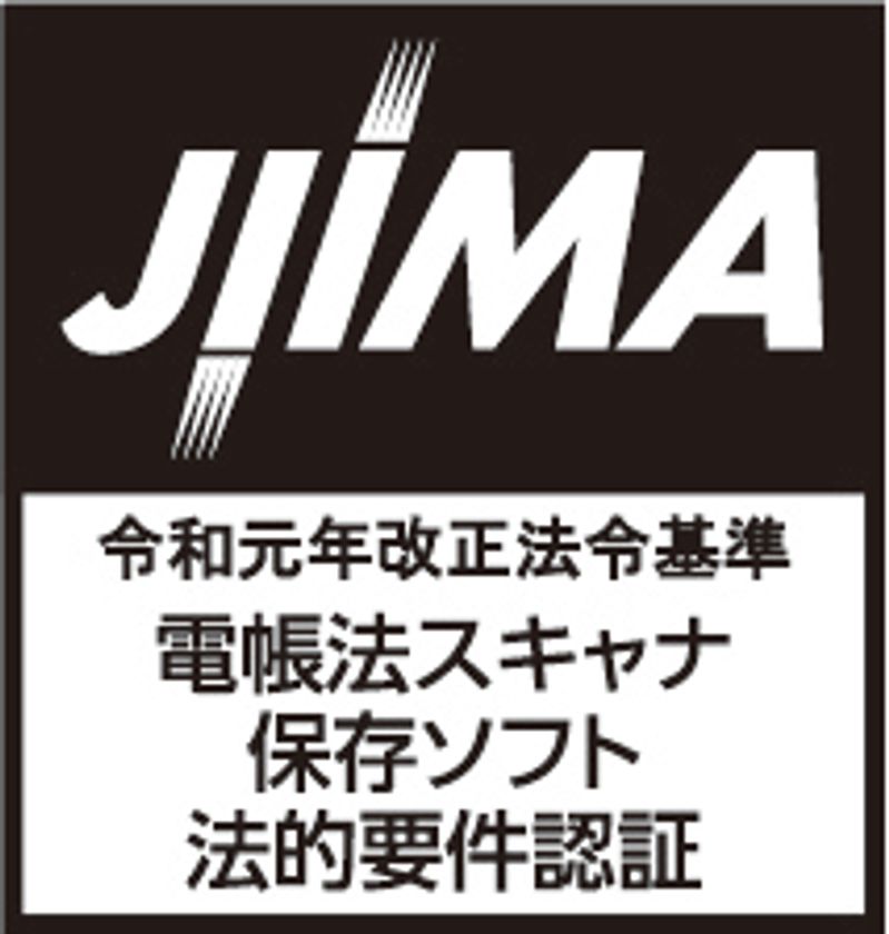 電帳法による国税関係書類のスキャナ保存対応ソフトウェアの機能仕様をチェックし、JIIMAが法的要件を満足していると判断したものを認証する制度です。この制度により、そのソフトウェアを導入する企業は、電帳法が要求している要件を個々にチェックする必要がなく、安心して導入することができます。また、認証した製品は、JIIMA及び国税庁のホームページで公開され、次のようなロゴ(例)の表示が認められます。