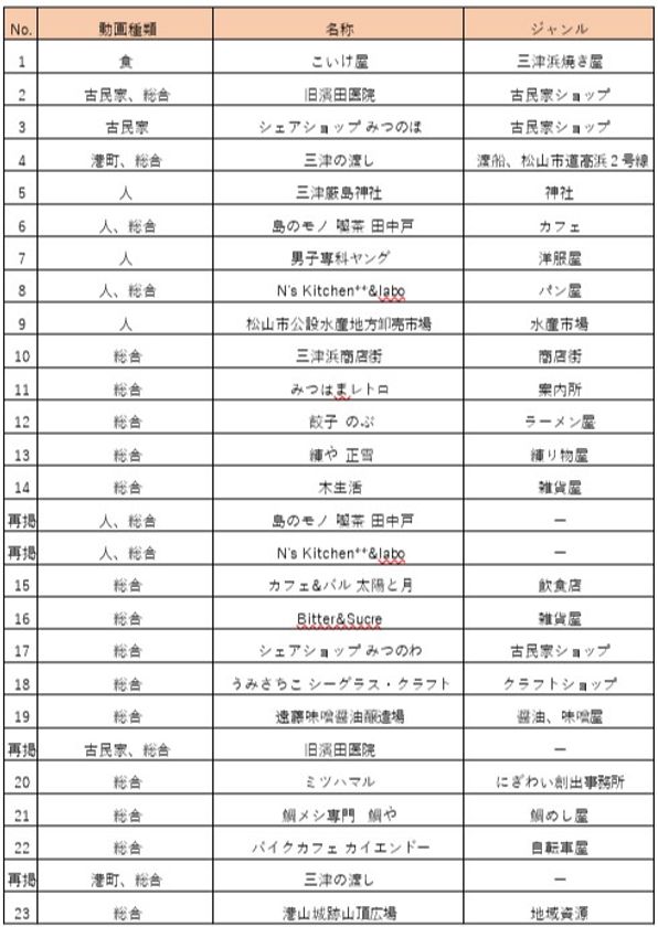 町全体の紹介を主観動画で撮影しており、観光しているような雰囲気を味わえる動画となっています。三津の特徴的な景色、さらに魅力的な物販、飲食、サービスのお店が登場します。
