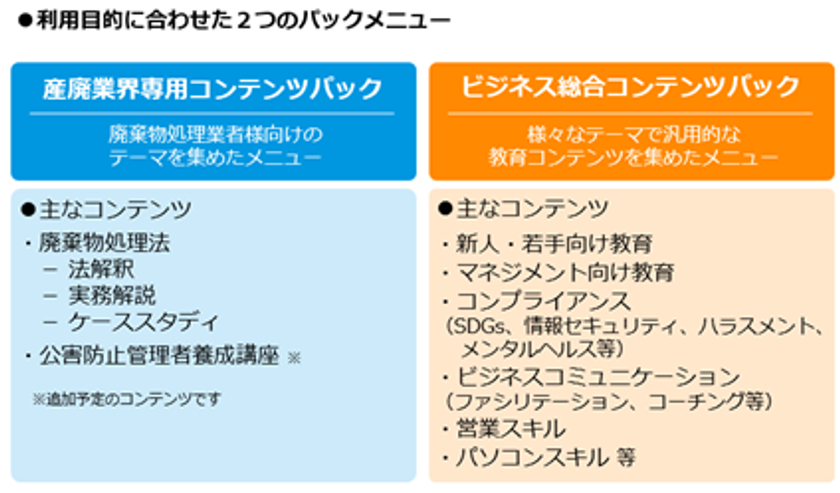 廃棄物処理法(法解釈、実務解説、ケーススタディ)、公害防止管理者養成講座などを動画で学ぶことができます。加えて一般的なビジネスコンテンツもご用意しております。現在、廃掃法関連動画が20本あり、今後も追加予定です。